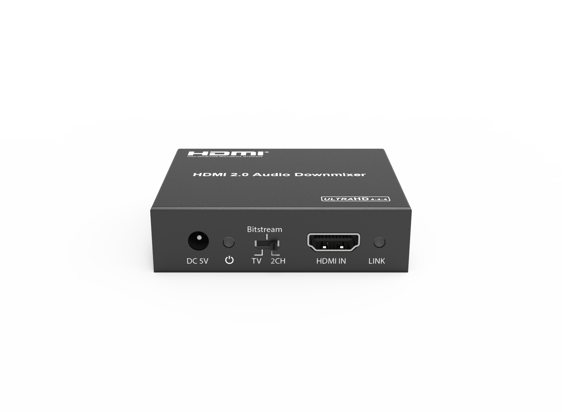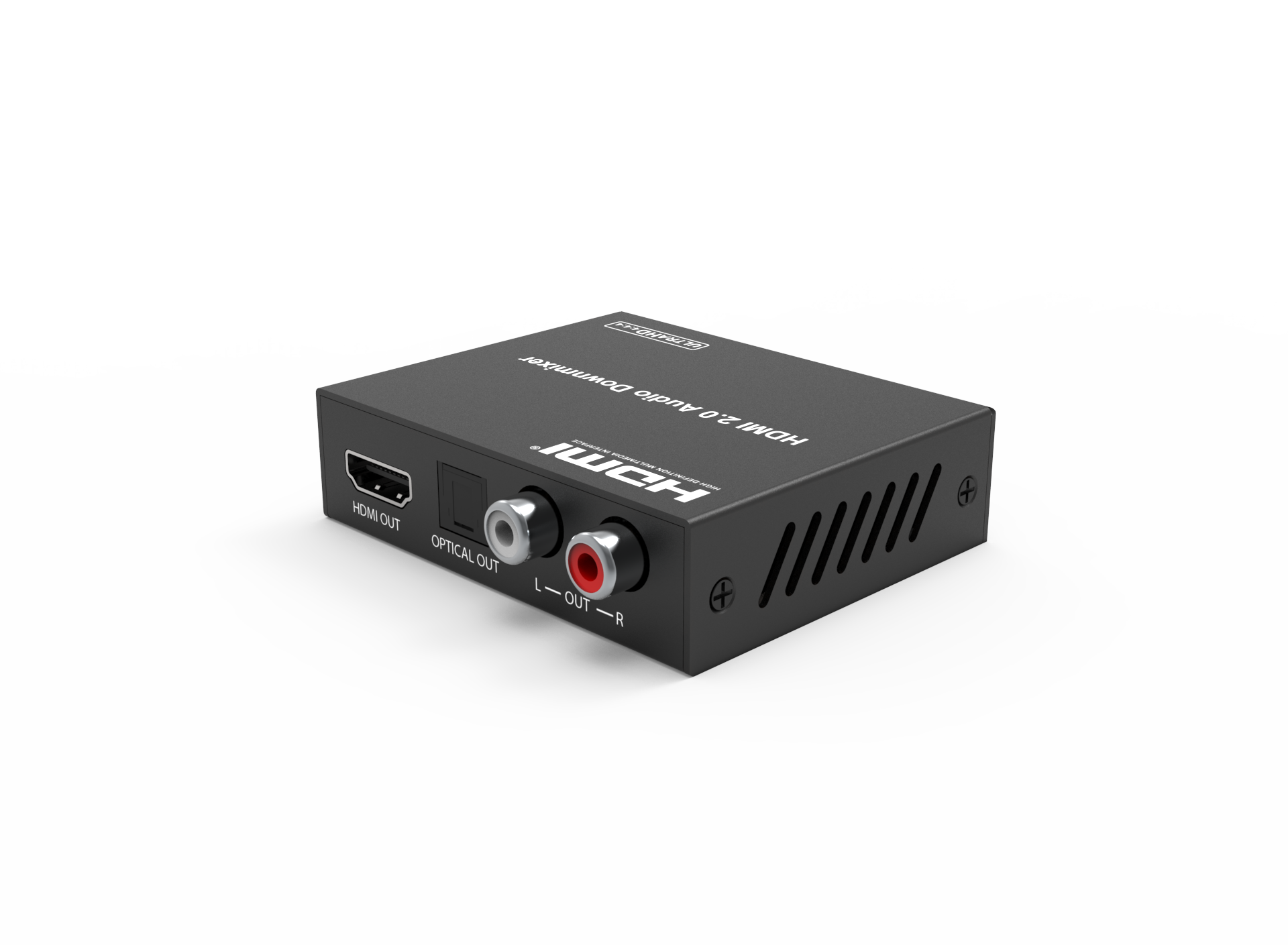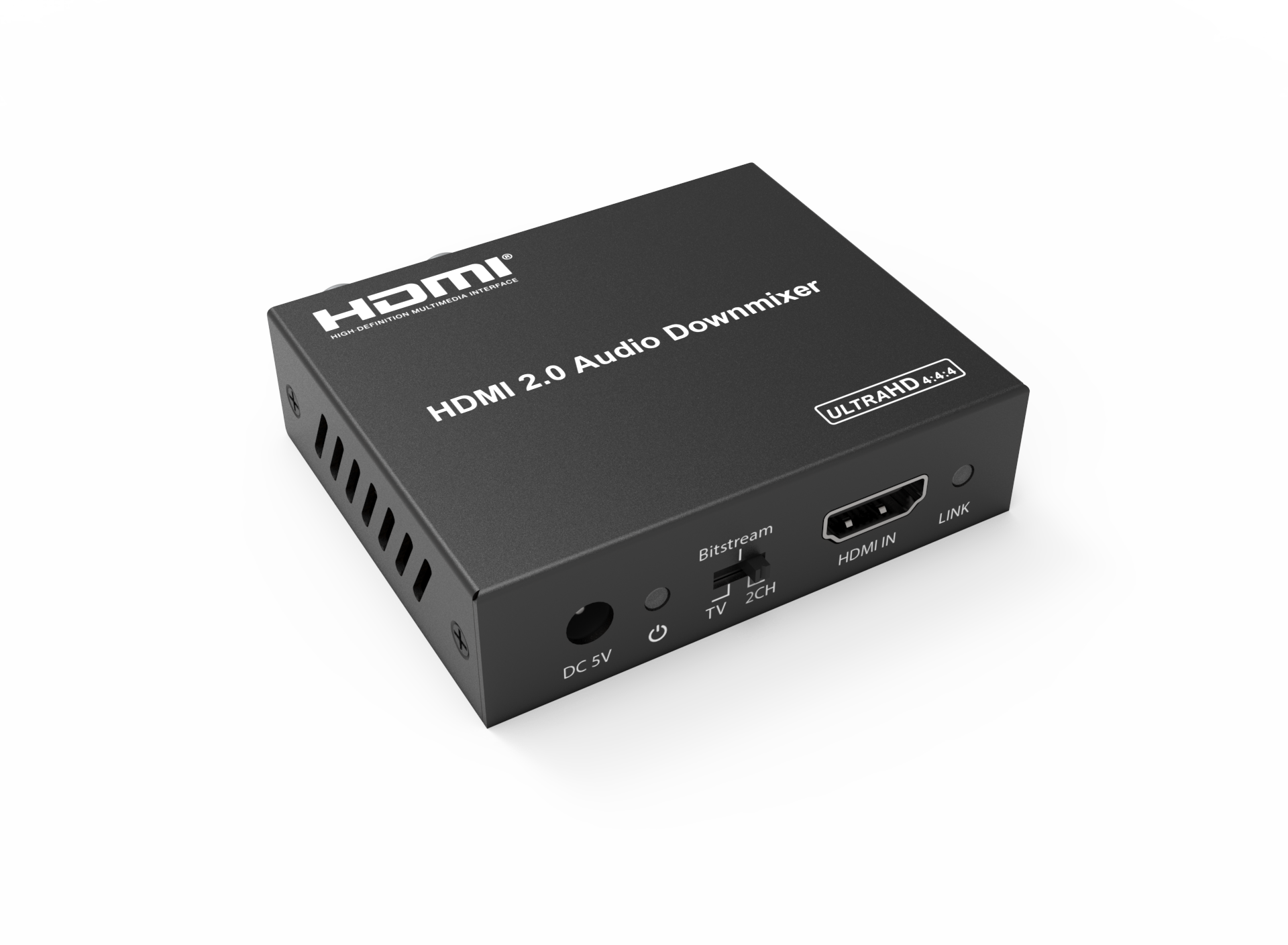 The HDMI 18Gbps Audio Extractor could extract audio signals from any HDMI compliant source to digital optical or analog stereo L/R audio outputs. For maximum flexibility, this audio extractor also supports bitstream audio down-mix to analog stereo output and keeps optical and HDMI out audio passthrough. Further, both input and output HDMI support video resolution up to 4K2K\@50/60Hz (YUV444). It supports 10bits HDR (High Dynamic Range) pass through and HDMI high resolution digital audio formats bypass, LPCM 2CH, Dolby TrueHD, Dolby Digital Plus, Dolby Atmos and DTS-HD Master Audio, audio sampling rate up to 192 kHz. HDCP 2.2 and CEC bypass are supported.
